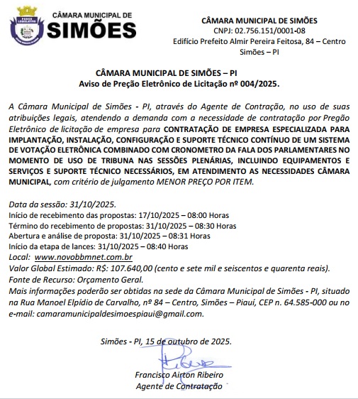 Contratação de empresa especializada para implantação, instalação, configuração e suporte técnico contínuo de um sistema de votação eletrônica combinado com cronometro da fala dos parlamentares no momento de uso de tribuna nas sessões plenárias, incluindo equipamentos e serviços e suporte técnico necessários, em atendimento as necessidades câmara municipal
