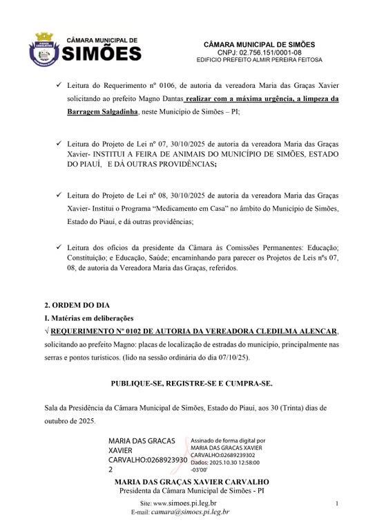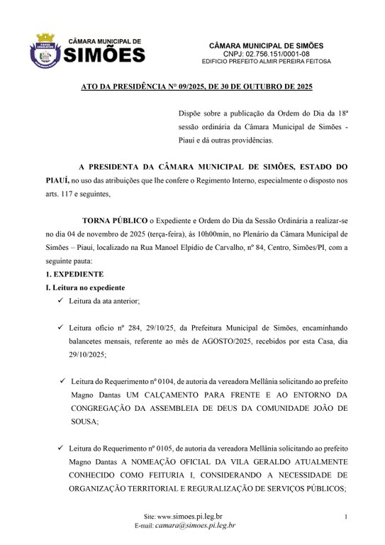 Dispõe sobre a publicação da Ordem do Dia da 18ª sessão ordinária da Câmara Municipal de Simões - Piauí e dá outras providências.