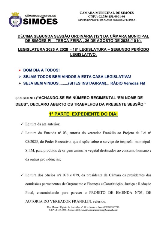 DÉCIMA SEGUNDA SESSÃO ORDINÁRIA (12ª) DA CÂMARA MUNICIPAL DE SIMÕES-PI - TERÇA-FEIRA , 26 DE AGOSTO DE 2025,(10 h).