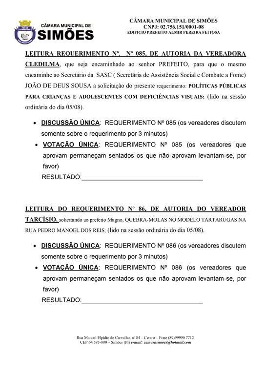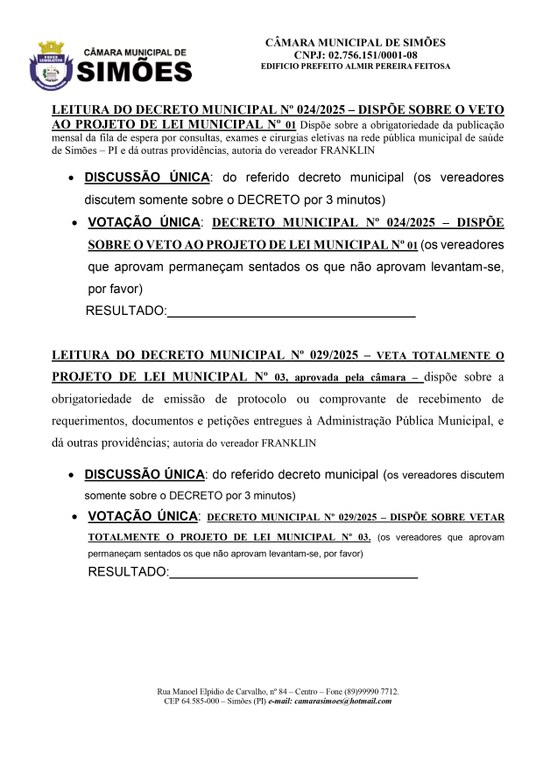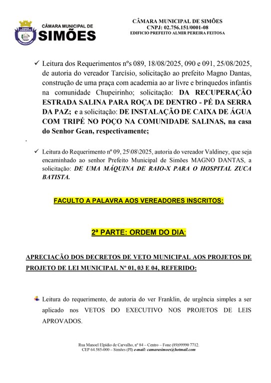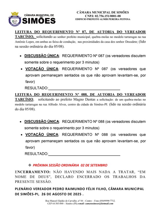 ROTEIRO DA SESSÃO ORDINÁRIA DA CÂMARA MUNICIPAL DE SIMÕES-PI