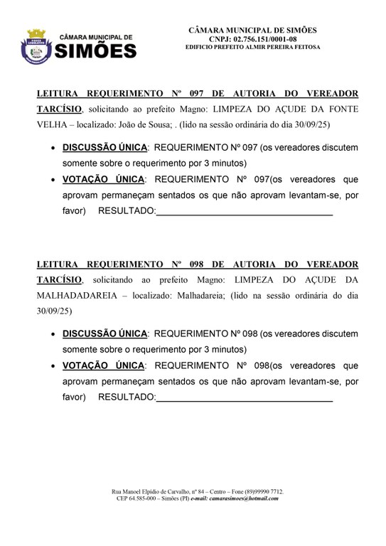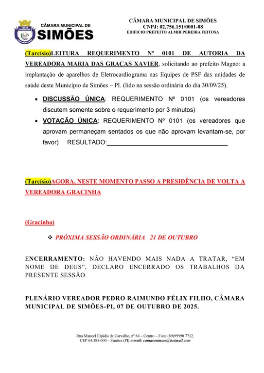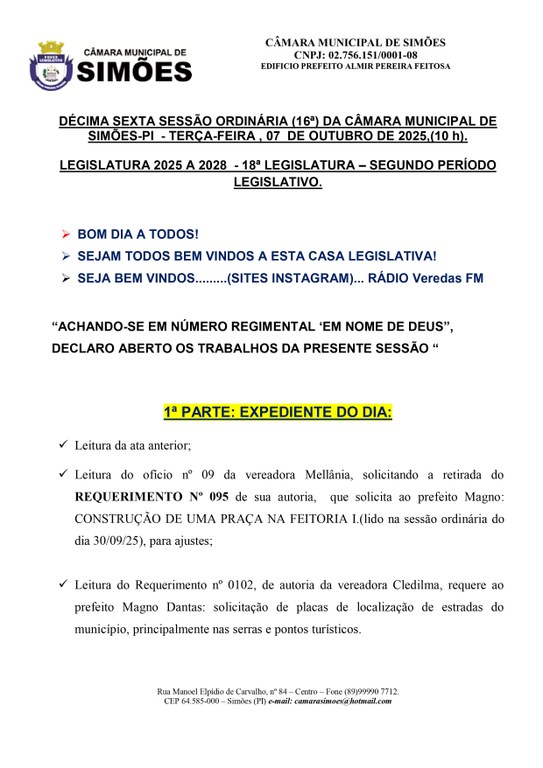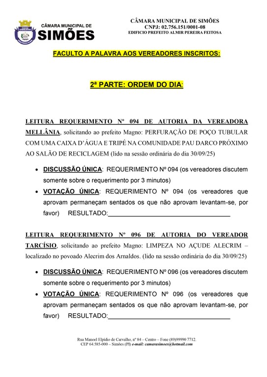 ROTEIRO DA SESSÃO ORDINÁRIA DA CÂMARA MUNICIPAL DE SIMÕES-PI